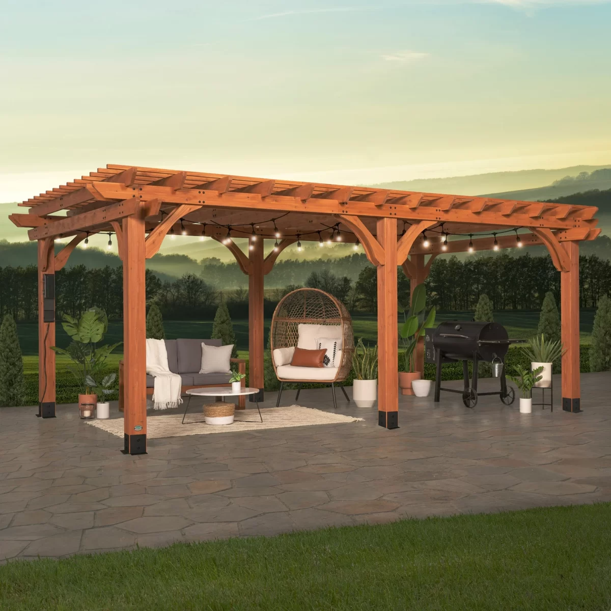 Transform your outdoor space with the Backyard Discovery 20′ x 12′ Beaumont Pergola, a stunning and durable structure designed to elevate your backyard. Crafted from 100% cedar wood, this pergola naturally resists decay while offering a timeless, traditional design with multi-level roof trellises and dual structural corbels for a touch of elegance.